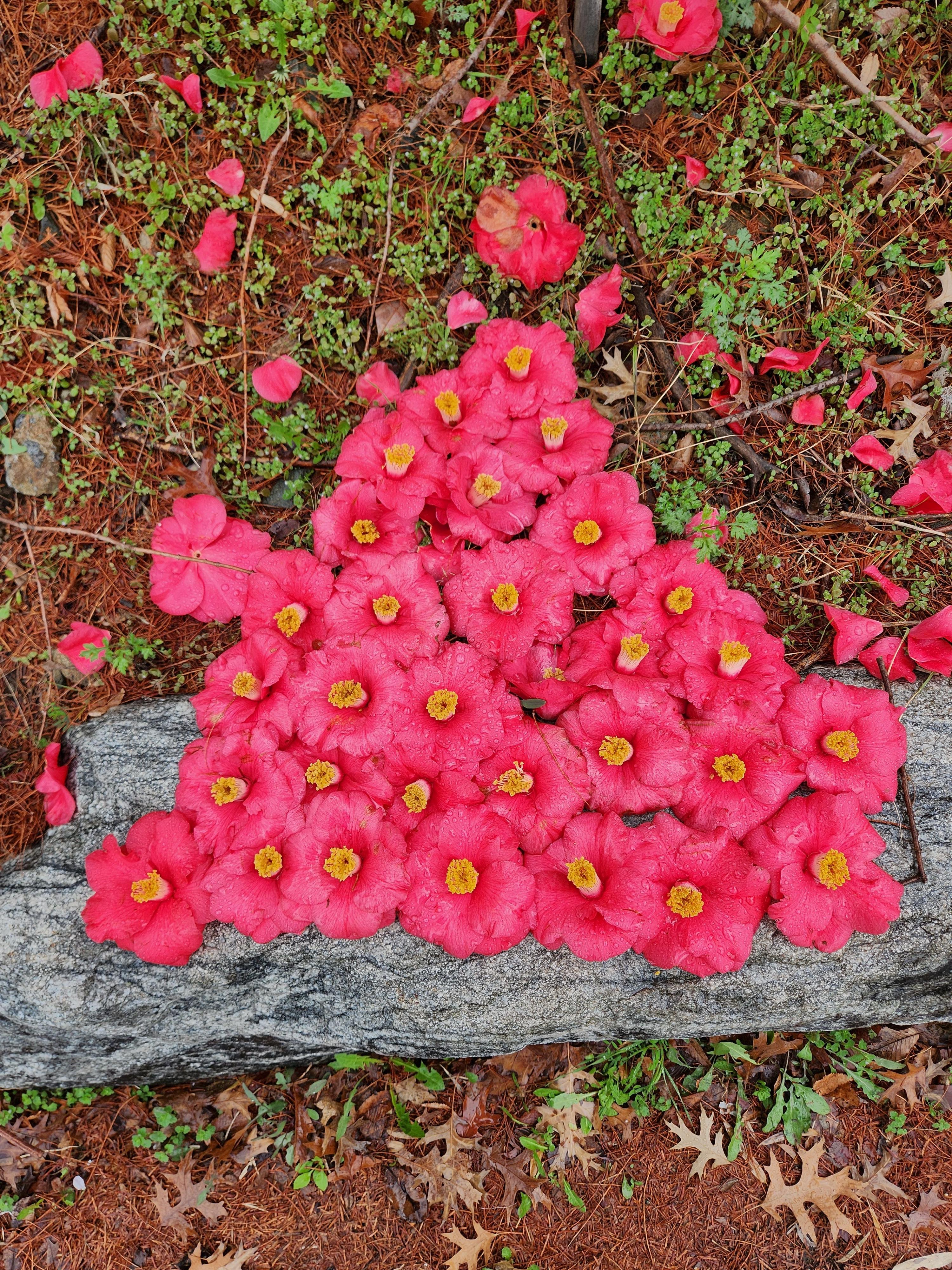 보통 꽃들은 꽃잎이 하나하나 떨어지는데 동백은 꽃잎이 전부 붙은 채 한송이씩 통째로 떨어진다고 해요. 그래서인지 길가에 누군가가 저렇게 이쁘게 꽃무덤을 만들어 놓았네요.