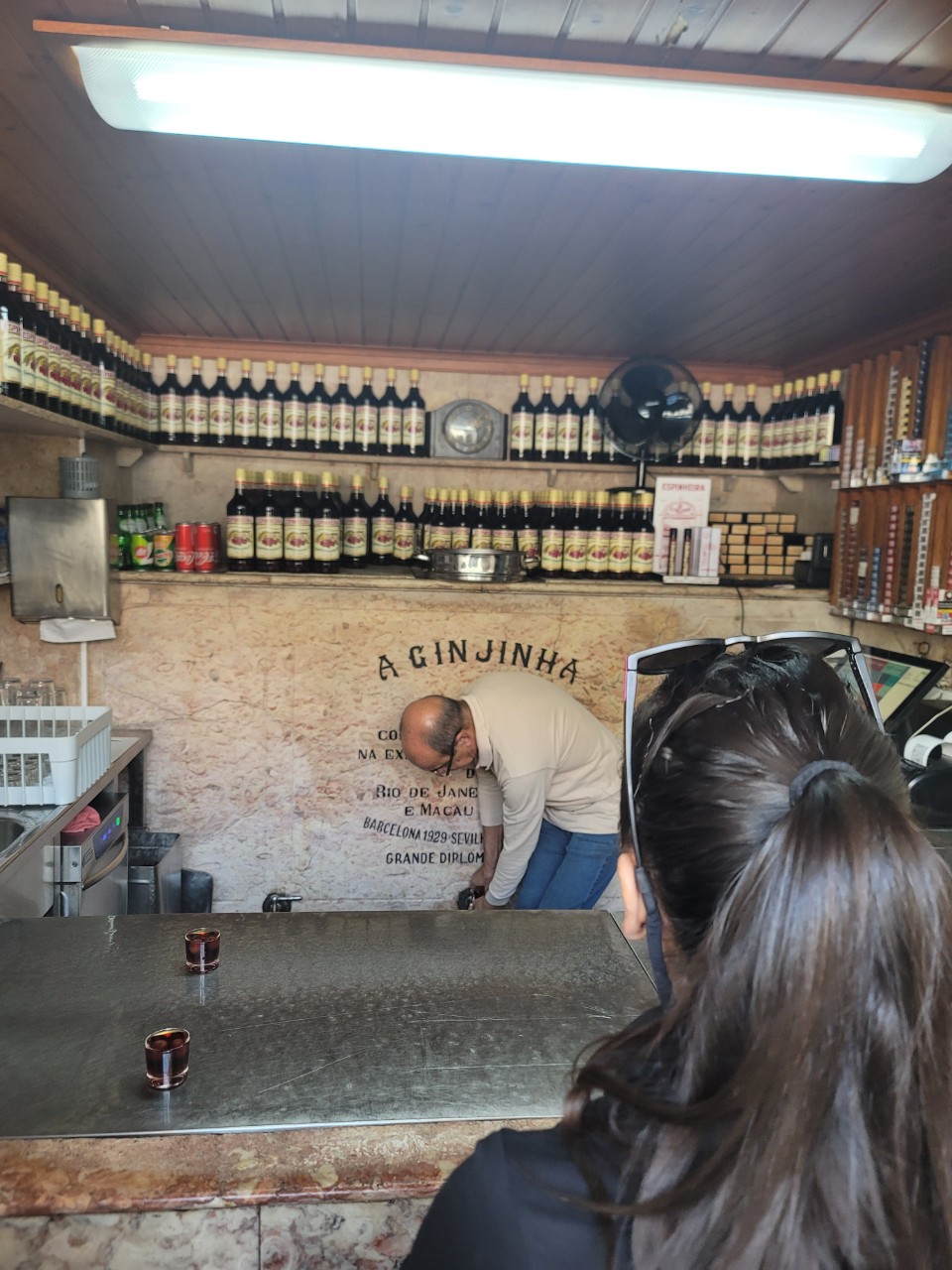 드디어 방문한 A Ginjinha 아 진지냐는 위에서 말한 나타 포르투게자 바로 옆에 정면이 개방되어 있는 오래된 주점으로 체리주 만을 전문으로 파는 선술집이다. 이미 술집 입구엔 줄을 서는 서너명과 이미 술을 구입해 체리와 비슷한 진지냐 리큐어를 홀짝홀짝 마시며 씨를 뱉는 손님들이 대여섯명 되어 보였다.