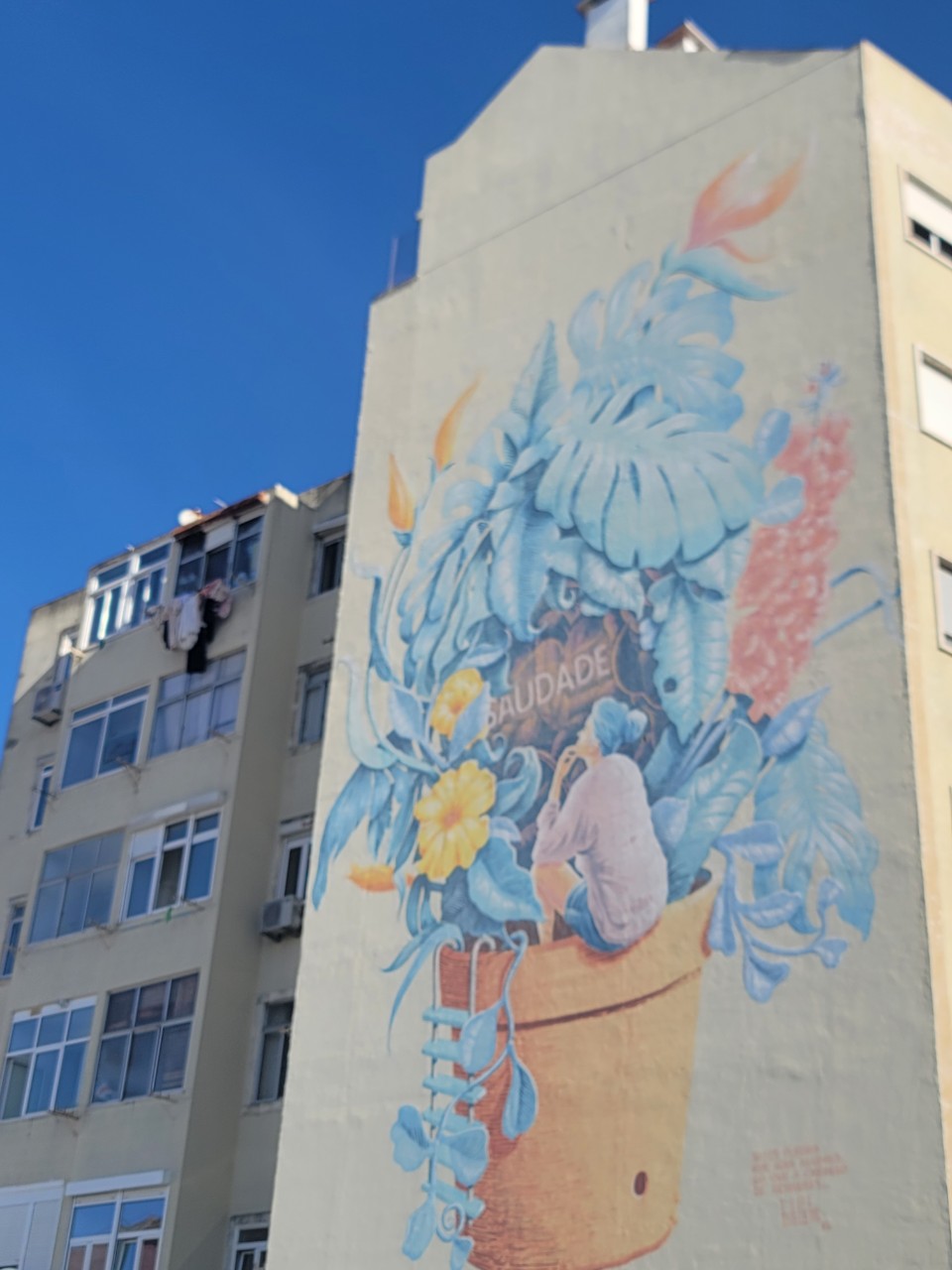 Convento Graca 그라싸 수도원에서 좀 더 지나가 왼쪽으로 돌아서면 나홀로 아파트 벽면에 마리오 벨렝이 그린, 사우다데 Saudade 라는 벽화가 나오고 그 옆에도 그래피티 담장이 나오는데 이러한 리스본의 거리 예술들을 눈에 담으며 걷는것도 가치있어 보인다.