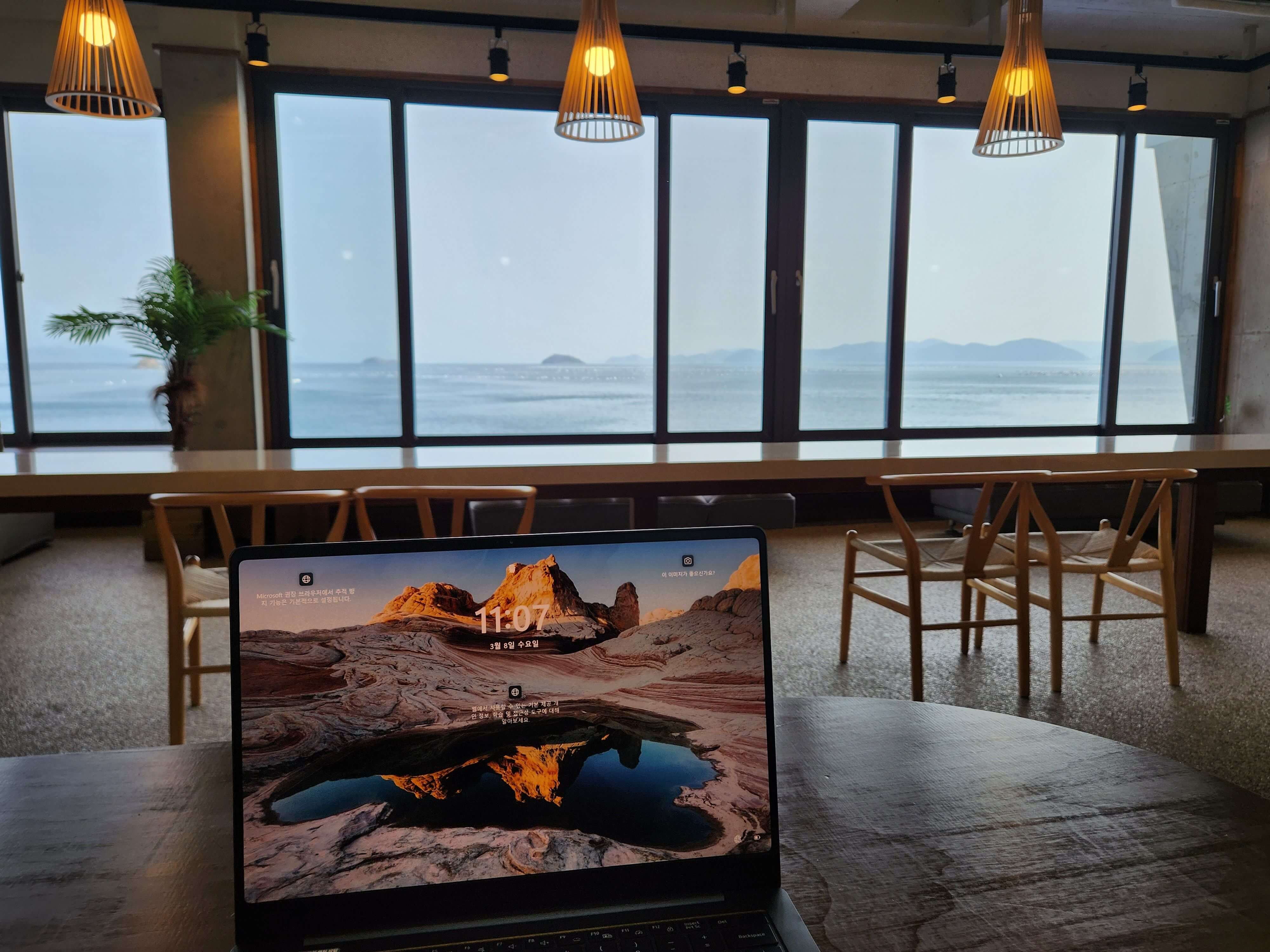 이곳은 오션뷰가 시원스레 보이고 테이블 위치도 갑갑하지 않아서 편안하게 물멍을 하거나 작업을 하기에도 아주 좋은 장소였습니다. 개인적으로 여기 앉아서 하루종일 작업을 하면 굉장히 행복할 것 같다는 생각을 했습니다. 평일이라서 그런지 사람도 별로 없어서 공간을 거의 독차지하는 호사를 누렸습니다. 단점이라면 차로만 이동을 할 수 있다는 것인데 요즘엔 자차로 여행을 많이들 다니시니까 큰 단점이라고 할 수는 없습니다. 편안하게 바다를 바라보면서 휴식을 하고 싶으신 분들에게 강력하게 추천하는 오션뷰 카페입니다.