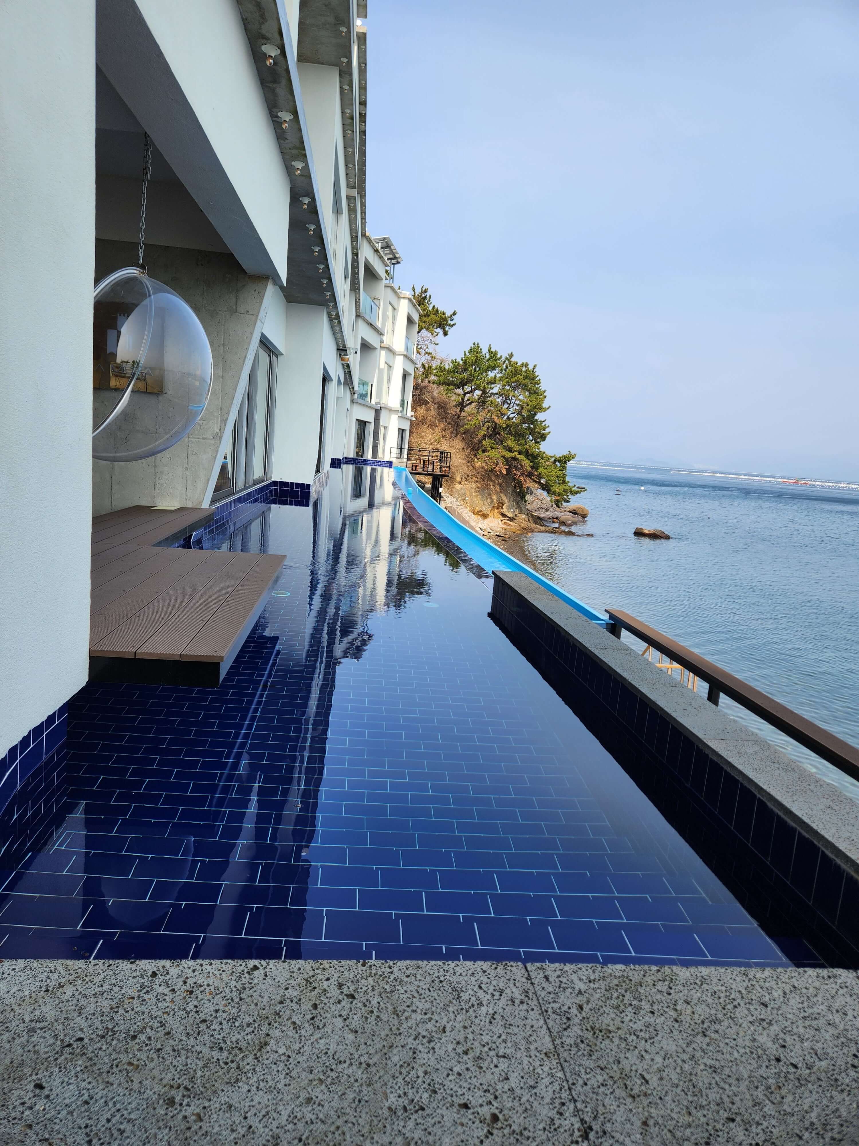 평일날 오픈 시간에 맞추어서 가니 손님이 없어서 아주 한가했습니다. 입구부터 공들여 꾸며놓은 듯한 인상을 받았고 아주 정갈했습니다. 그리고 제일 마음에 드는 것은 바다가 아주 가깝고 잘 보인다는 점이었답니다. 호텔로비처럼 널찍하고 테이블 세팅도 독특해서 색다른 분위기를 원하시는 분들에게 좋은 경험이 되실 거예요. 인테리어가 아주 세련되서 사진도 이쁘게 나오고 창가에 놓여있는 소파는 물멍에 최적화된 자리를 제공합니다.