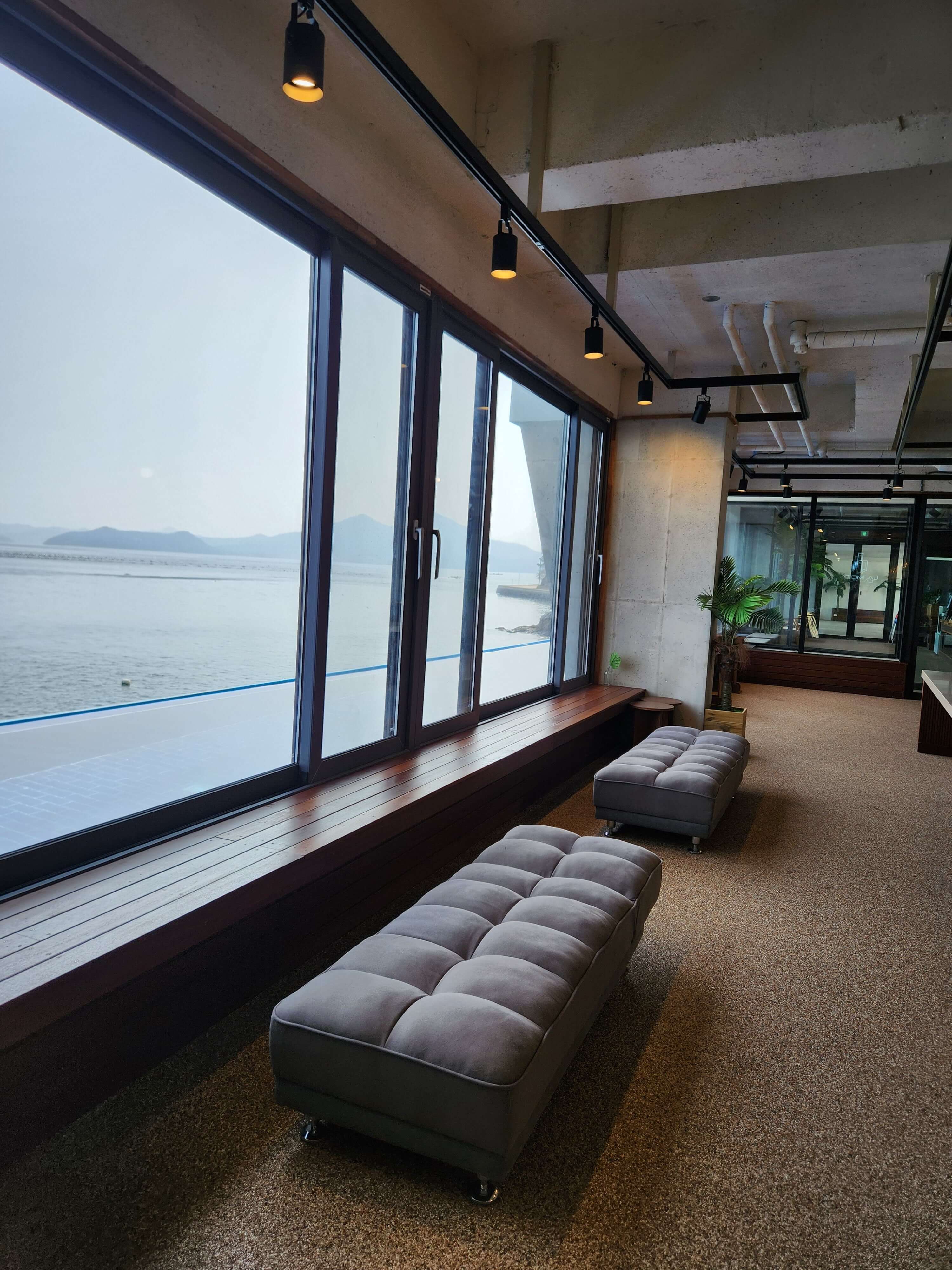 평일날 오픈 시간에 맞추어서 가니 손님이 없어서 아주 한가했습니다. 입구부터 공들여 꾸며놓은 듯한 인상을 받았고 아주 정갈했습니다. 그리고 제일 마음에 드는 것은 바다가 아주 가깝고 잘 보인다는 점이었답니다. 호텔로비처럼 널찍하고 테이블 세팅도 독특해서 색다른 분위기를 원하시는 분들에게 좋은 경험이 되실 거예요. 인테리어가 아주 세련되서 사진도 이쁘게 나오고 창가에 놓여있는 소파는 물멍에 최적화된 자리를 제공합니다.