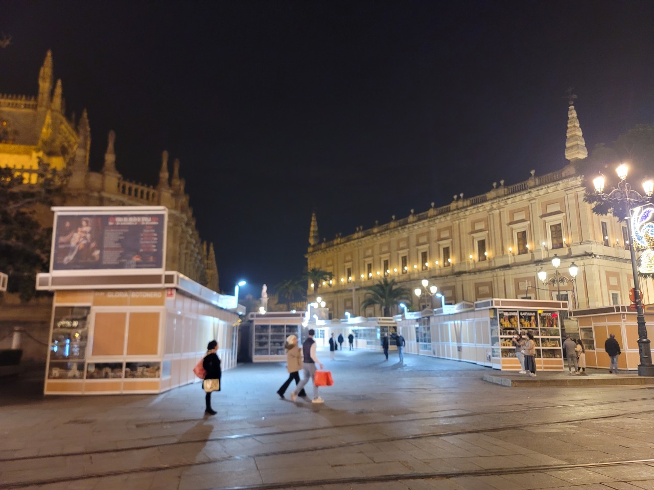 세비야 대성당을 좀더 지나가니 그 옆으로 크리스마스 마켓시장의 판매대들이 보였으나, 밤 10시라서 그런지 그날 영업이 끝나서 판매점포들이 모두 닫힌 상태로 그 앞을 사람들이 지나갈 뿐이고 휑하여  조금만 빨리 왔으면 하는 아쉬운 마음이 들었다.