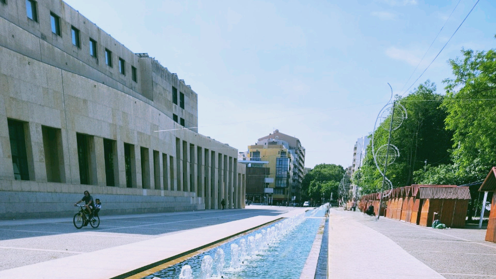 플라타너스 가로수 길을 따라 시내로 깊숙히 들어가니 마토지뉴스 시청이 나타났다. 청사 건물 옆엔 분수대가 있고, 그 분수대 우측엔 부활절 또는 산투 안토니우 축제나 크리스마스 마켓시즌때 봄직한 상점들이 길게 늘어서 있다.