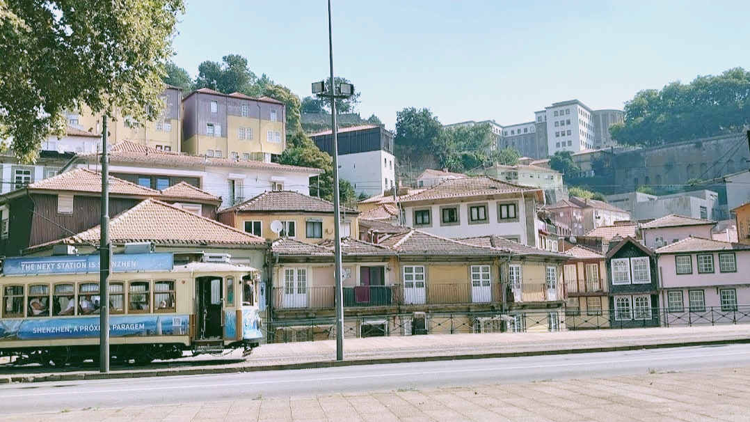도우루 강변에서 바라본, 트램이 지나가는 마을 풍경