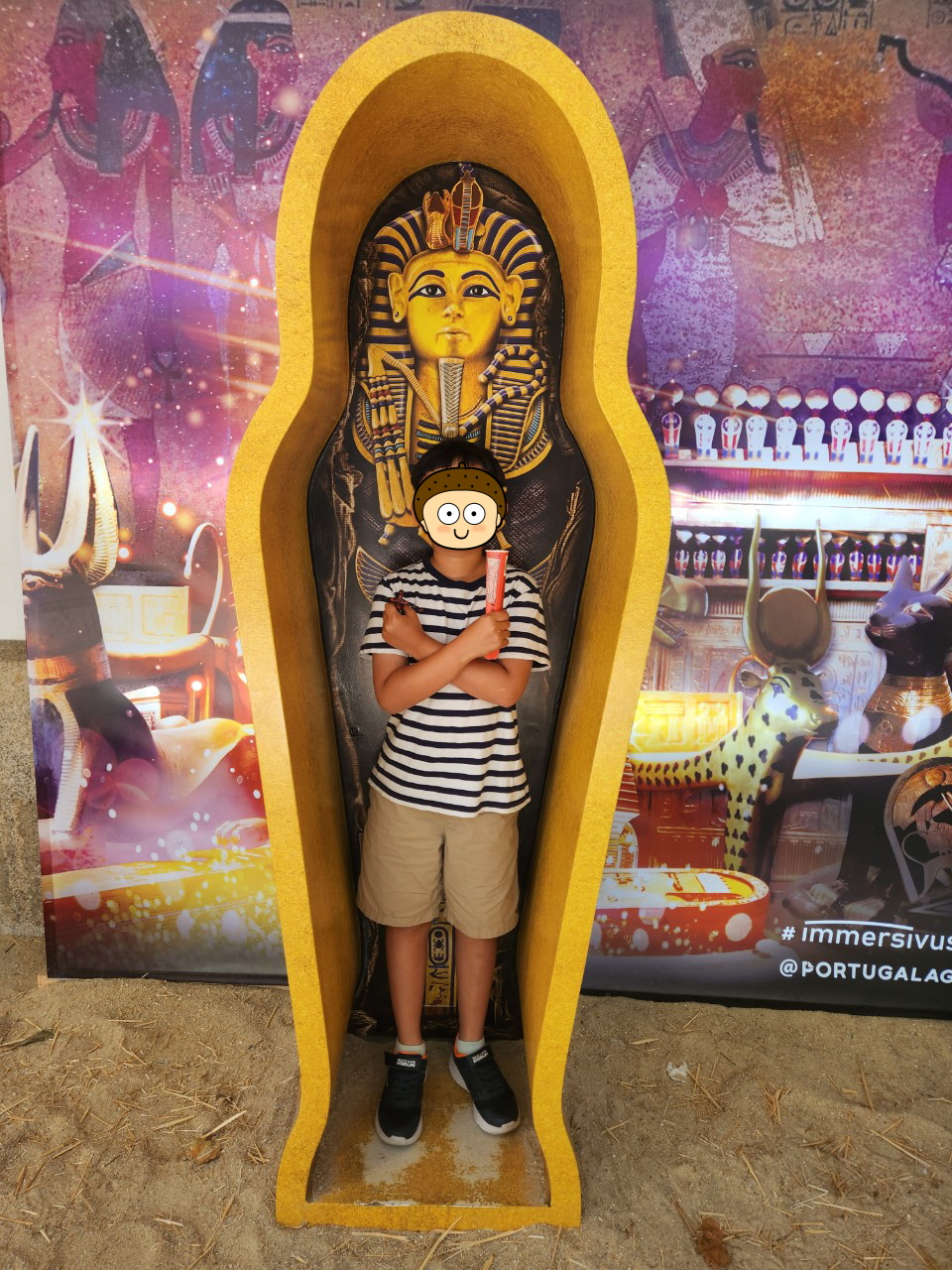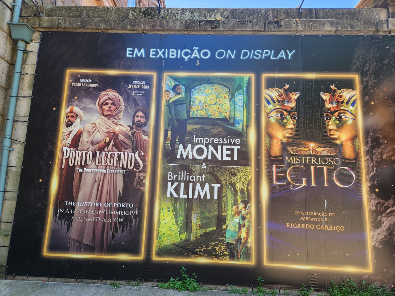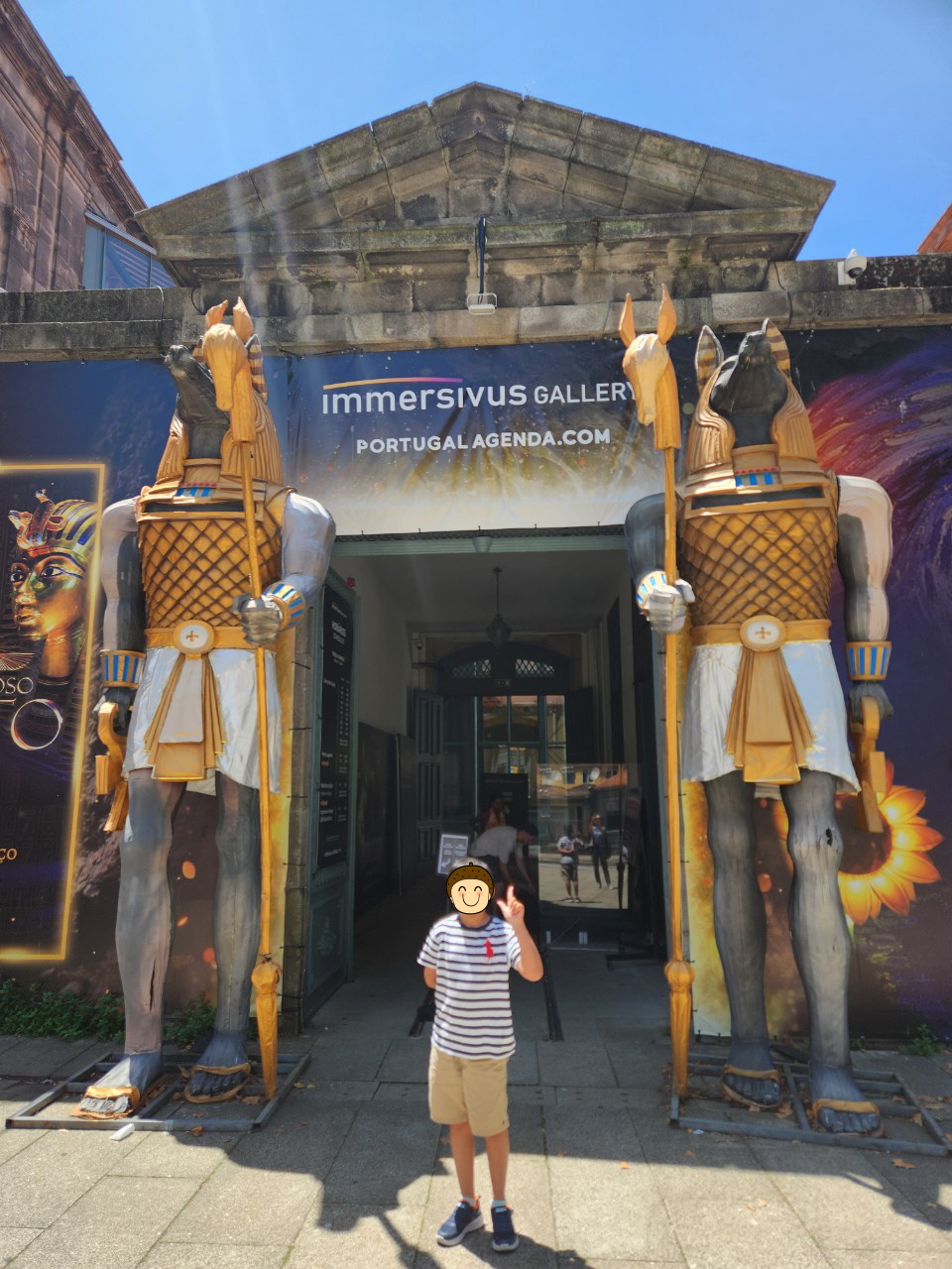 위 Alfândega do Porto 건물의 Immersivus Gallery에는 Van Gogh의 미술을 주제로 하는 Living Van Gogh Port 및 30분짜리 오디오 비주얼 체험인 Misterioso Egito와 같은 몰입형 전시가 이루어 지는데, 이곳은 도우루 강가 쪽에 있어서 경치도 좋고 역사 중심지인 포르투 구시가지와 가까워서 여기까지 도보로 걸어 왔더니 해바라기 모형과 이집트풍 늑대 얼굴을 한 문지기가 우리들 눈에 띈다.