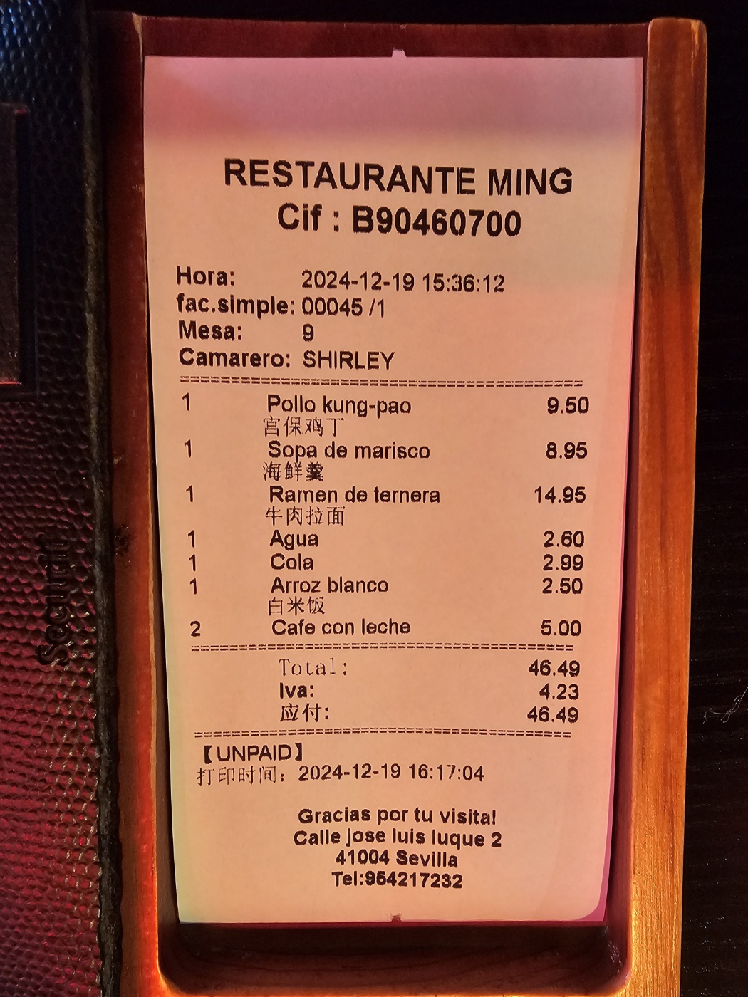 혹시나 하고 들어온 중식당 Ming에서 음식맛이 정말 괜찮아서 엄지척 추천하게 되네요~ 세비야 여행 중 문어 뽈보, 농어구이, 이베리코, 여러 타파스 등 느끼하거나 차가운 서양 음식 대신에 따끈한 국물이 있는 동양요리가 생각나면 여기 Ming 들려서 속 풀고 가는 것도 좋을듯 싶네요^^