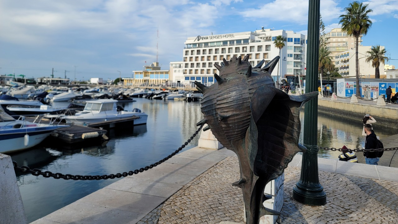파로 오벨리스크에서 걸어서 파루 마리나 Marina de Faro 방향으로 조금만 걷다 보면 Eva Senses Hotel 에바 센세스 호텔이 나오고 그 옆에 선착장에 소라 껍데기 조형물이 반긴다.