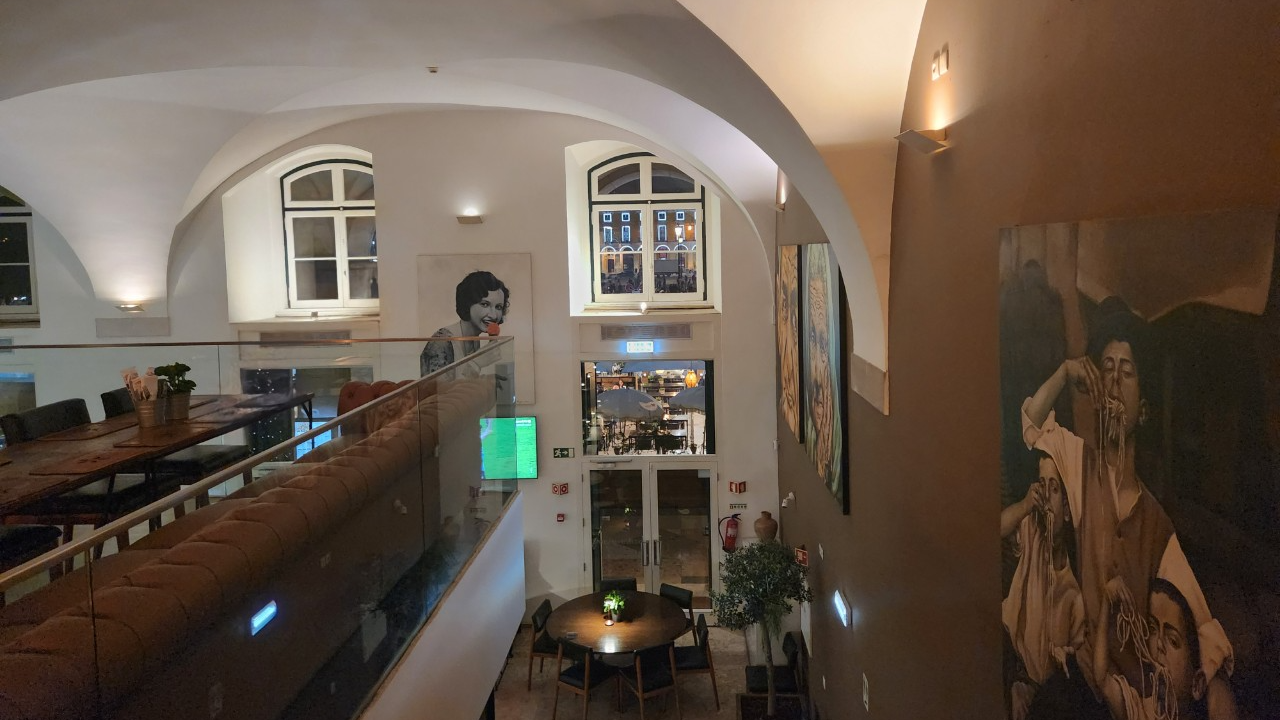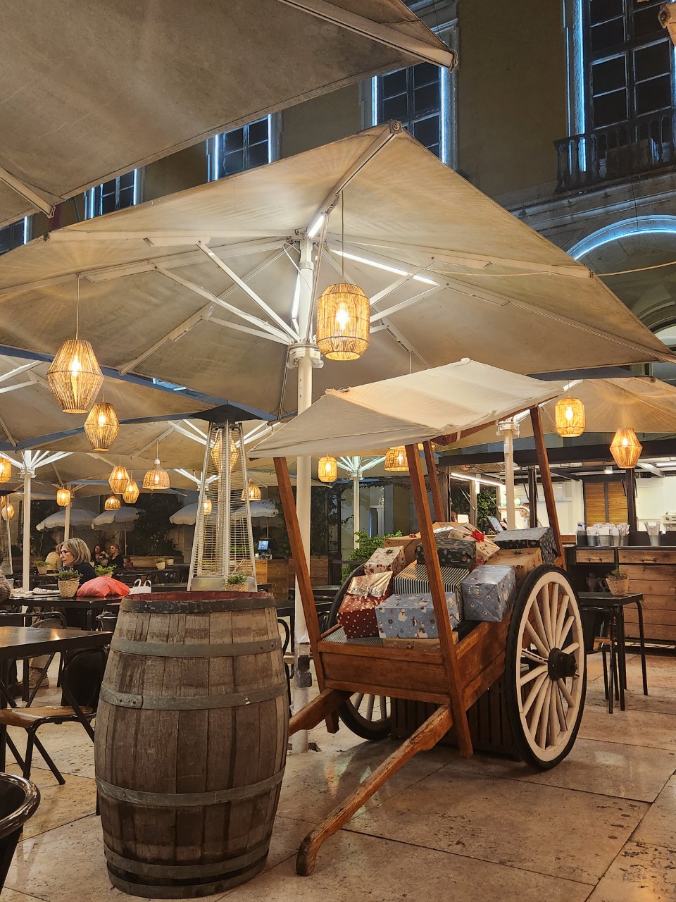 야외 테라스에 선물박스가 쌓여있는 수레가 크리스마스 분위기를 자아내고 있어서 코메르시우 광장의 멋진 야외 경관을 즐기며 이탈리아 풍의 스파게티와 피자로 식사를 하기에 정말 좋아 보인다.