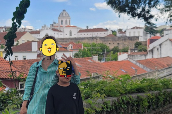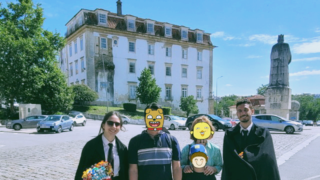 Traje Academico라는 검은 망토를 걸친 학생들이 지나가길래 우리 가족과의 사진 촬영을 청했고 이들이 흔쾌히 응해 주었다. 학생 복장이라는 의미를 갖고 있는 검은 망토는 학생들의 사회적 평등을 위해 포르투갈 전역의 대학에서 사용된 전통 학생복으로 최초의 대학인 코임브라 대학교에서 시작된 문화라고 한다.